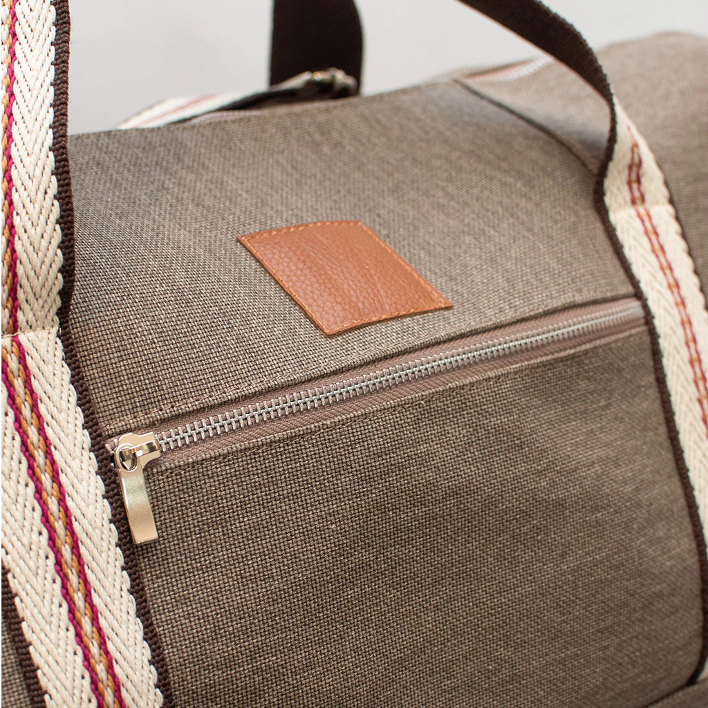 Bolso XL de viaje confeccionado en tela Panamá. A diferencia de nuestro otro bolso Panamá este es 10 cm más largo, por si necesitas sumar más cosas!! Cuenta con detalles de manijas cortas y correa larga en cinta tejida. Tiene un bolsillo con cierre en el frente. Viene completamennte forrado y cuanta con un bolsillo interno con cierre.
