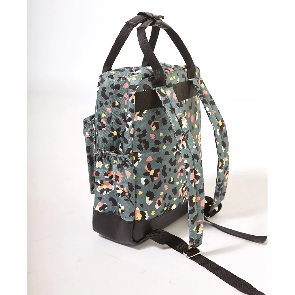 Tiene un bolsillo con cierre en el frente y separacion con elastico para la botellita. Cuenta con manijas cortas de facila agarre y cintas mochileras en la espalda.